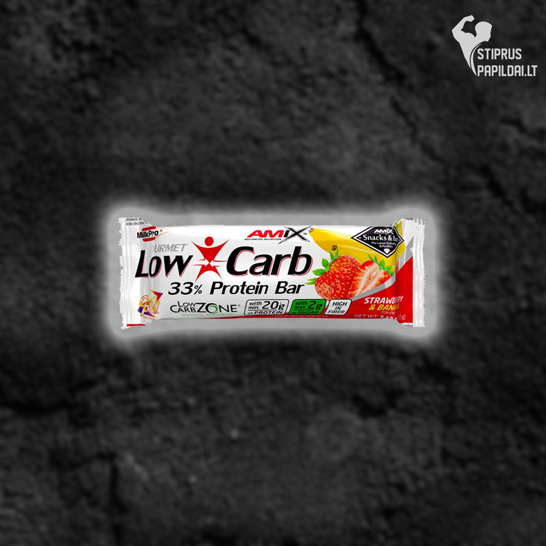 Amix™ Low-Carb 33% Protein Bar – tai skanus batonėlis, turintis mažai cukraus, daug skaidulų ir ypač aukštos kokybės baltymų. Praturtintas itin kokybiškais baltymais, kurių pagrindą sudaro pieno ir pieno išrūgų izoliatas, šie baltymai pasisavinami itin lengvai ir greitai. Amix Low-Carb yra puikus ir sveikas užkandis saldumynų megėjams ir visiems propaguojantiems ar norintiems propaguoti sveiką gyvenimo būdą. Šokoladukų masė padaryta iš daržovių riebalų, o saldinti tik aukštos kokybės saldikliais. Dėl aukštos kokybes greitai pasisavinančio baltymo ir mažo kiekio riebalų, batonėliai neapsunkina ir nepučia pilvo.